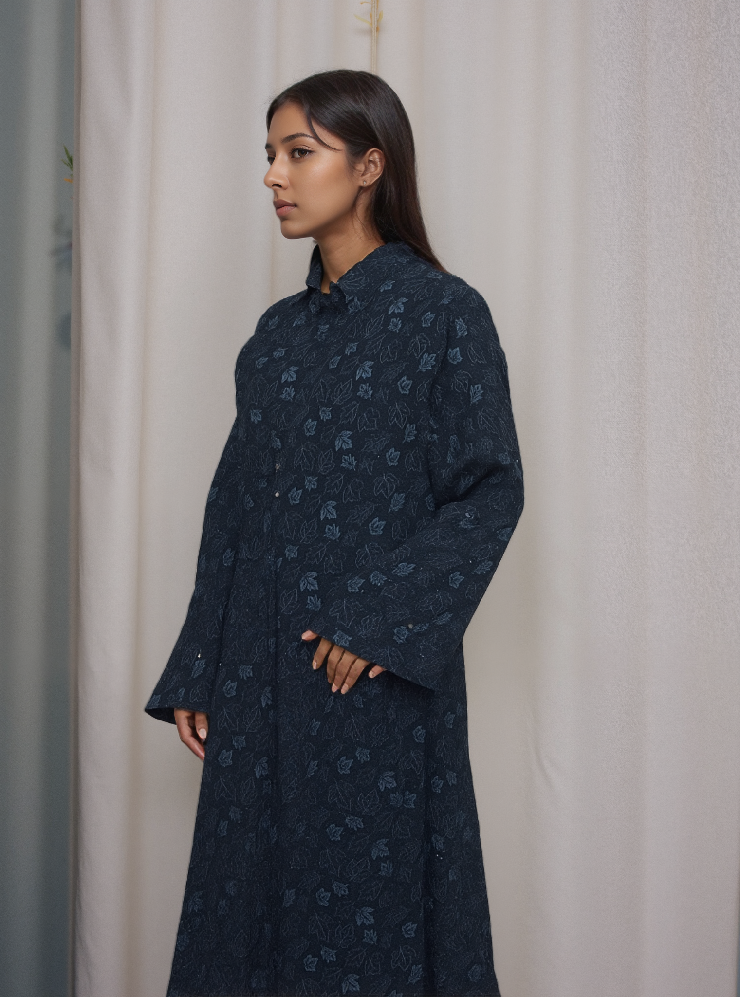 This abaya is a dark-colored garment with a subtle all-over floral or botanical pattern. It features a tailored collar, a loose, flowing silhouette, and wide, flared sleeves. The design combines traditional modest wear with contemporary styling, suitable for various occasions.