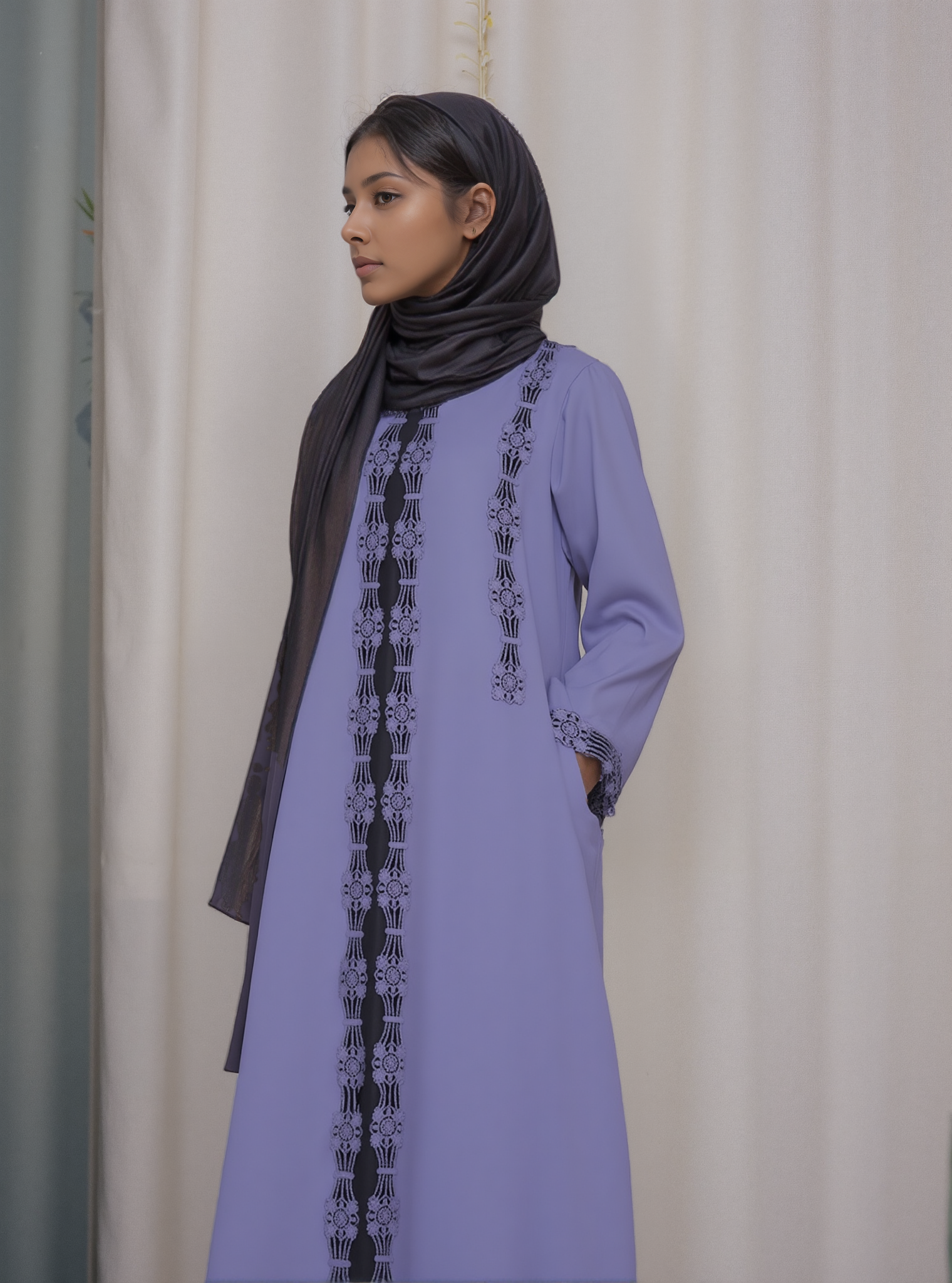 This Chic Lace Detailed Abaya blends modern elegance with timeless charm, featuring delicate lace accents that add a touch of sophistication to its flowing, graceful silhouette.