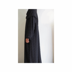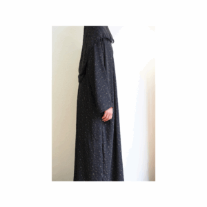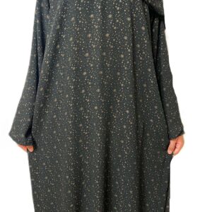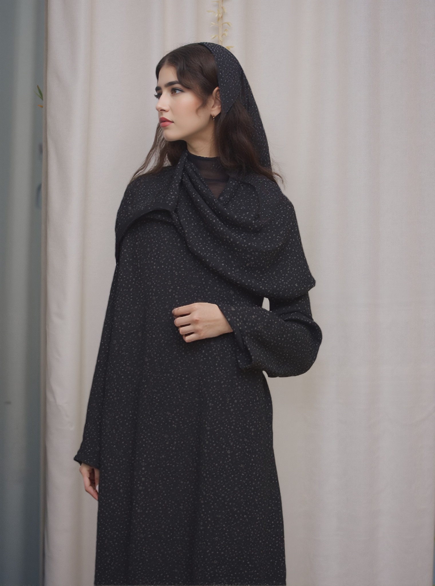 Embrace the elegance of winter with the Snowflake Dust Printed Abaya. This stunning black or dark grey abaya features a delicate, all-over pattern of white speckles, evoking the subtle beauty of falling snow. The design is a sophisticated blend of contemporary style and modest fashion, highlighted by its unique draped collar and loose, flowing silhouette. Crafted from a high-quality fabric that drapes beautifully, this abaya offers both comfort and a refined aesthetic.